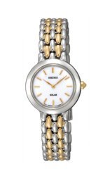 Two tone stainless steel case measures 25mm wide by 6mm thick. Polished link bracelet includes a push button deployment clasp. Classic white dial is well accented by gold tone hands and hour markers. Solar powered Quartz storing power from any available light. The scratch resistaSeiko Women's SUP049 Solar Dress Watch Do not Miss!! Two tone stainless steel case measures 25mm wide by 6mm thick. Polished link bracelet includes a push button deployment clasp. Classic white dial is well accented by gold tone hands and hour markers. Solar powered Quartz storing power from any available light. The scratch resista... Seiko Women's SUP049 Solar Dress Watch