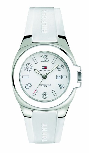 Sport watch, Quartz movement, Polished silver-tone hands with luminous accents, Polished silver-tone hands with white accents, Polished silver-tone stainless steel bezel with white enamel, tonneau (barrel) shaped case, crown and caseback, 50 meters/165 feet water resistant White sport watch; Rubber Tommy Hilfiger Women's 1780916 Sport Stainless Steel with White Plastic Bezel Watch Do not Miss!! Sport watch, Quartz movement, Polished silver-tone hands with luminous accents, Polished silver-tone hands with white accents, Polished silver-tone stainless steel bezel with white enamel, tonneau (barrel) shaped case, crown and caseback, 50 meters/165 feet water resistant White sport watch; Rubber ... Tommy Hilfiger Women's 1780916 Sport Stainless Steel with White Plastic Bezel Watch